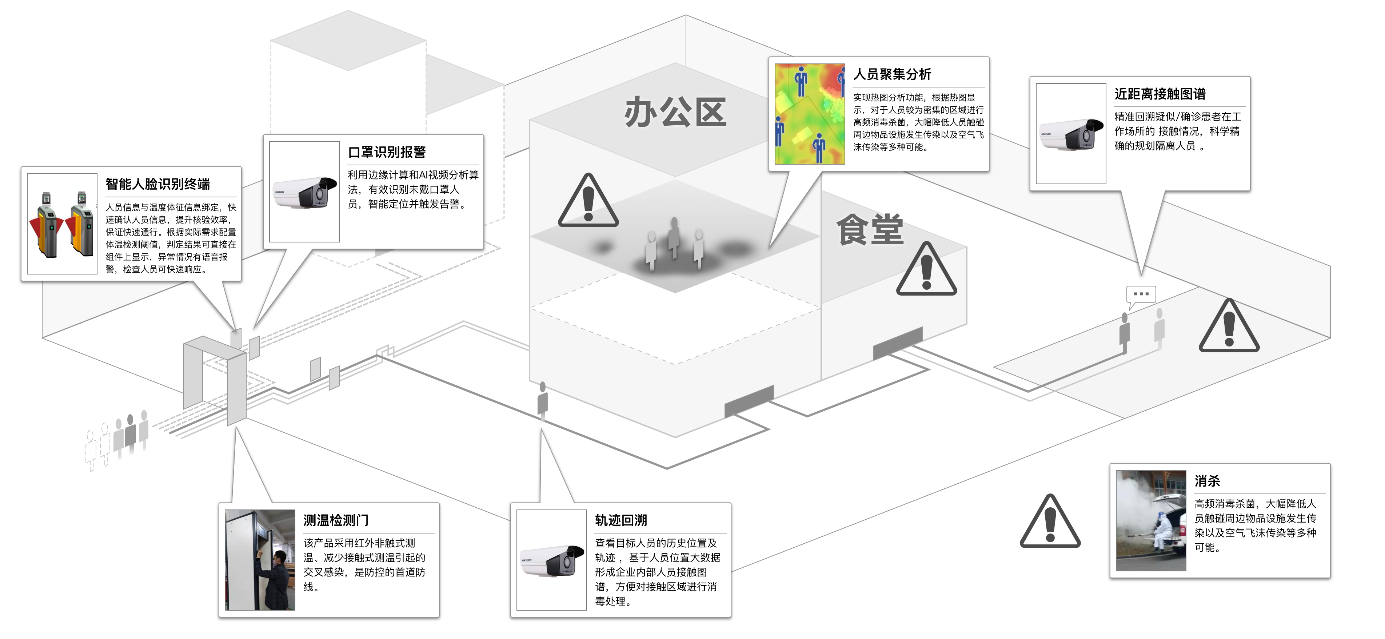 “園區(qū)防控解決方案”全稱“智慧園區(qū)緊急公共事件預(yù)警防控終端產(chǎn)品及云服務(wù)解決方案”,是從線上健康打卡、非接觸AI人體溫度檢測(cè)、人臉識(shí)別、口罩識(shí)別、物聯(lián)網(wǎng)終端的數(shù)據(jù)采集匯聚、“風(fēng)險(xiǎn)人員”活動(dòng)軌跡和接觸回溯、近距離接觸預(yù)警、人員密集區(qū)域熱圖、重點(diǎn)區(qū)域高頻消殺、結(jié)合新冠肺炎確診識(shí)別知識(shí)庫(kù),結(jié)合智慧園區(qū)的門禁管理、視頻監(jiān)控、運(yùn)動(dòng)軌跡識(shí)別,打造復(fù)工后的廠區(qū)(園區(qū))全自動(dòng)、全區(qū)域、全天候、全目標(biāo)覆蓋的主動(dòng)式疫情智慧園區(qū)預(yù)警防控平臺(tái),為園區(qū)安全復(fù)產(chǎn)復(fù)工保駕護(hù)航。