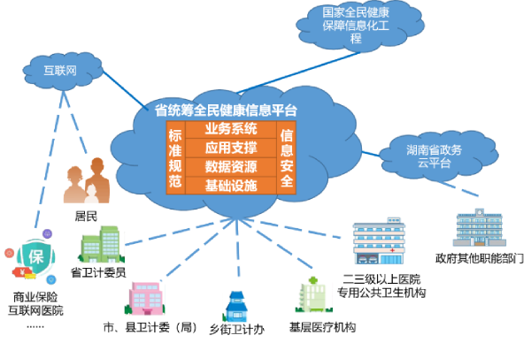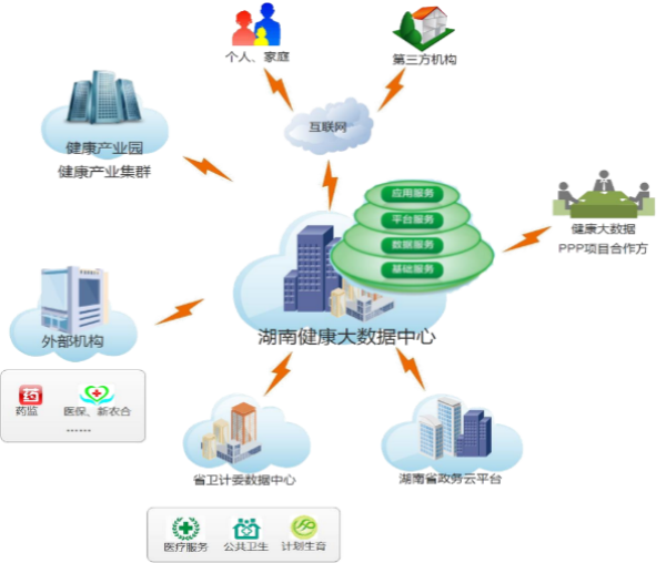 湖南健康大數(shù)據(jù)中心建設(shè),一方面通過政策配套支持,與湖南省衛(wèi)生健康委省級數(shù)據(jù)中心、湖南省政務(wù)云平臺以及相關(guān)外部單位對接,在政策許可、授權(quán)監(jiān)管下,使用現(xiàn)有信息化成果與醫(yī)療衛(wèi)生服務(wù)資源;另一方面,通過引入具有豐富經(jīng)驗的醫(yī)療健康項目合作單位,基于健康大數(shù)據(jù)云平臺,建設(shè)“醫(yī)療健康+互聯(lián)網(wǎng)”應(yīng)用,并面向個人、家庭、第三方機構(gòu)開展運營工作,開展健康大數(shù)據(jù)應(yīng)用,培育醫(yī)療健康服務(wù)產(chǎn)業(yè)。