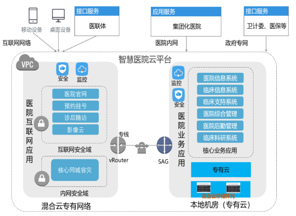 依托當(dāng)?shù)氐?/span>IDC資源,通過建設(shè)公共云和本地專有云組成混合云模式,在保障業(yè)務(wù)安全、信息安全的前提下,支撐互聯(lián)網(wǎng)醫(yī)療應(yīng)用的拓展及數(shù)據(jù)共享,構(gòu)建區(qū)域智慧醫(yī)療混合云平臺(tái)。