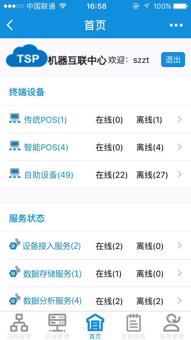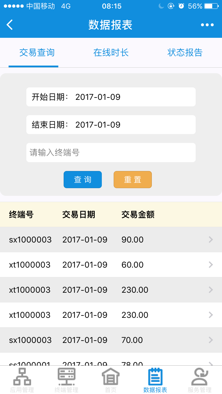 數(shù)據(jù)報(bào)表:各類型自助終端設(shè)備狀態(tài)報(bào)告的形成,掌控管理終端的最新動(dòng)態(tài)和狀況,查看在線時(shí)長、故障時(shí)長,以及對(duì)終端實(shí)時(shí)交易金額、交易碼的查詢。