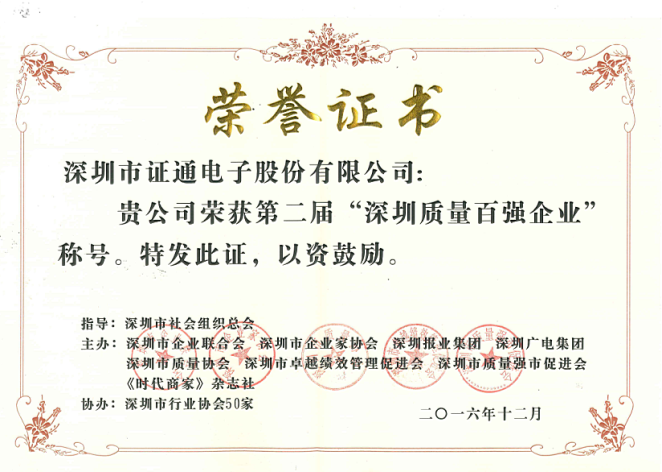 歷時(shí)八個(gè)月,深圳市證通電子股份有限公司在深圳市近500家申報(bào)企業(yè)中“鏖戰(zhàn)”而出,榮膺第二屆“深圳質(zhì)量百?gòu)?qiáng)企業(yè)”稱號(hào),同時(shí)獲得該榮譽(yù)的還有萬(wàn)科企業(yè)股份有限公司、中興通訊股份有限公司等100家企業(yè)單位。
