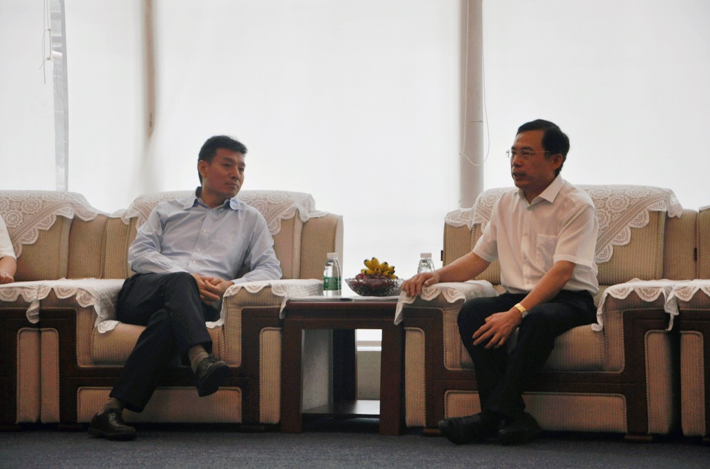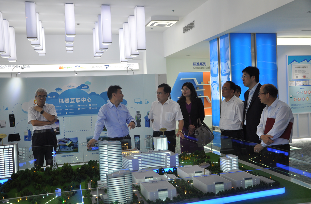 證通電子總裁曾勝?gòu)?qiáng)(左三)向?qū)幮г菩虚L(zhǎng)(左二)一行介紹證通規(guī)劃布局