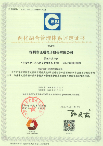 證通電子作為深圳市兩化融合試點(diǎn)企業(yè),2017年順利通過中國電子技術(shù)標(biāo)準(zhǔn)化研究院兩化融合管理體系評估審核組共兩個階段的的評審,于今年獲得兩化融合體系認(rèn)證證書。