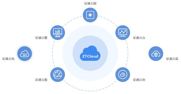 在功能組件上劃分為證通云棧、證通云臺、證通云池、證通云數(shù)、證通云固、證通云監(jiān)、證通云管七大部分。