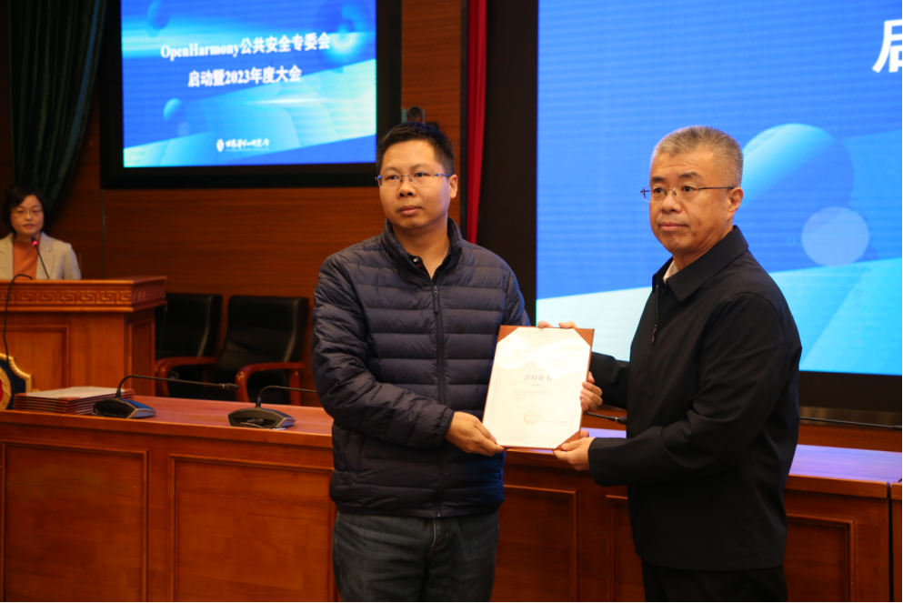 OpenHarmony項(xiàng)目群生態(tài)委員會(huì)公共安全專委會(huì)是OpenHarmony生態(tài)在公共安全行業(yè)的實(shí)踐推廣先鋒,致力于公共安全OpenHarmony項(xiàng)目群開源生態(tài)建設(shè),以警鴻操作系統(tǒng)為抓手,發(fā)揮行業(yè)引領(lǐng)和輻射作用,帶動(dòng)整個(gè)公共安全行業(yè)移動(dòng)應(yīng)用的變革。余兵副所長代表一所致辭并為證通公司頒發(fā)OpenHarmony公共安全專委會(huì)會(huì)員證書。他表示:公安部第一研究所擔(dān)任OpenHarmony生態(tài)委員會(huì)公共安全專委會(huì)會(huì)長單位,本著維護(hù)國家政治安全的責(zé)任,勇于擔(dān)當(dāng)、守正創(chuàng)新的信念,為公共安全行業(yè)創(chuàng)建自主可控的移動(dòng)信息化產(chǎn)業(yè)生態(tài),一所將充分發(fā)揮行業(yè)引領(lǐng)和輻射作用,帶動(dòng)整個(gè)公共安全行業(yè)移動(dòng)應(yīng)用變革,與生態(tài)委員會(huì)、華為公司以及各會(huì)員單位一起推廣公共安全OpenHarmony操作系統(tǒng)技術(shù),共建安全可控的OpenHarmony應(yīng)用體系。